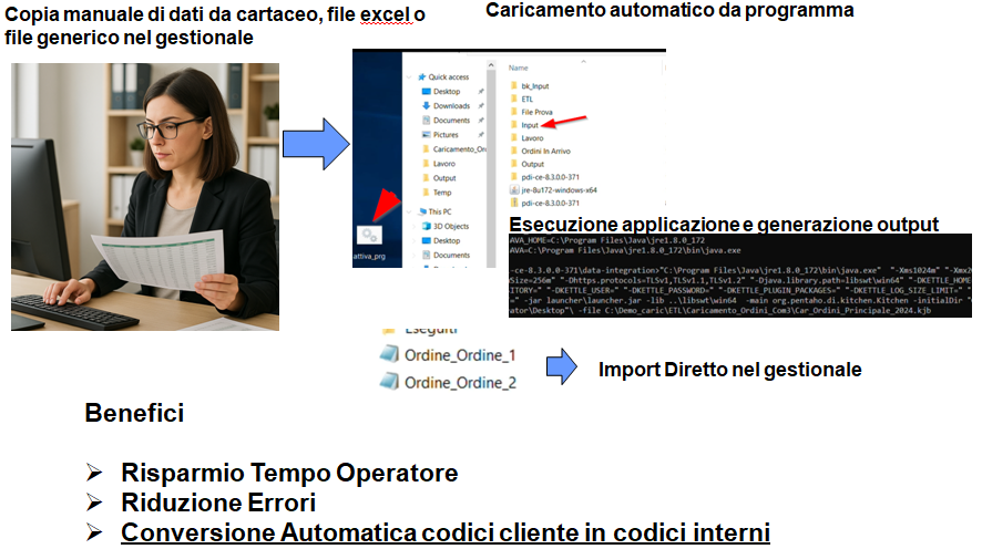 In molti casi l'operatore deve inserire i dati presenti in una copia commissione o similare, e in questi casi tramite l'applicazione può trasformare il file excel di INPUT, in un file di testo che può essere importato nel gestionale con pochi click.